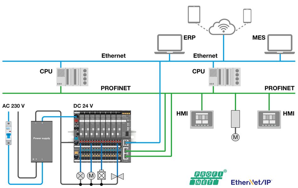 The intelligent CPC20 ControlPlex®® System protects your DC 24 V power distribution against overload and short circuit. The basis is the modular terminal block system Module 18plus. The ESX60D electronic circuit protector continuously records the load current and the load voltage of the system. These measuring values are bundled by the CPC20 bus controller and transmitted to the connected control systems. The system operator can continuously monitor his power distribution system and detect changes or aberrations at an early stage. The ControlPlex®®System thus prevents unplanned system downtimes, improves transparency and stabilises the production process, increases the quality of the goods produced and significantly increases plant availability.